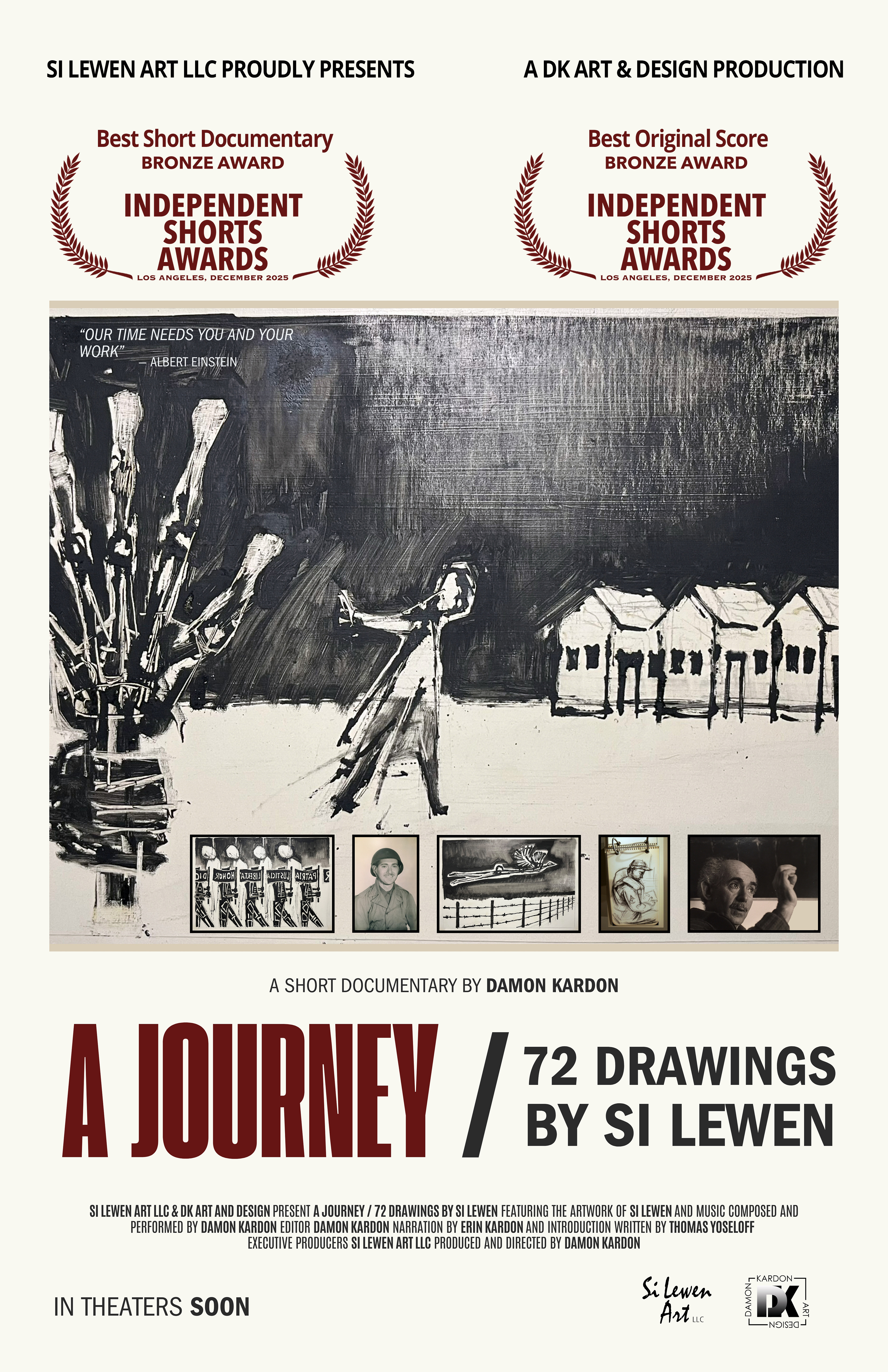 Brief Description/Synopsis: “A Journey: 72 Drawings by Si Lewen” is both a deeply personal tribute and a historical reflection on the life and art of Si Lewen (1918–2016)—a remarkable artist whose visual storytelling and humanistic vision left an indelible mark on twentieth-century art. The film presents, for the first time, all 72 sequential drawings from Lewen’s powerful visual narrative A Journey, accompanied by an original score composed and performed by his grandson, Damon Kardon, who also produced and edited the film. The presentation opens with an introduction written by publisher Thomas Yoseloff and is narrated by Erin Kardon, giving voice to Lewen’s legacy through his family’s creative lens. Si Lewen’s life embodies the 20th century’s most profound struggles and redemptions. An immigrant who fled Nazi Germany, he returned to Europe as a U.S. Army soldier—one of the famed “Ritchie Boys”—and bore witness to the horrors of Buchenwald during its liberation. His subsequent artistic career transformed trauma into universal imagery, exploring the cyclical nature of war and humanity’s longing for peace. Art Spiegelman, creator of Maus, has called Lewen one of the “grandfathers of the graphic novel,” and Albert Einstein once wrote to him, “Our time needs you and your work.” This documentary seeks to honor that legacy—bringing together Lewen’s art, words, and family to illuminate both history and the enduring power of creative resilience. (Official Trailer Below).